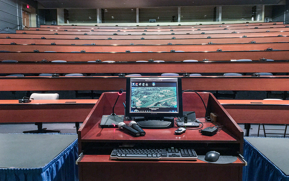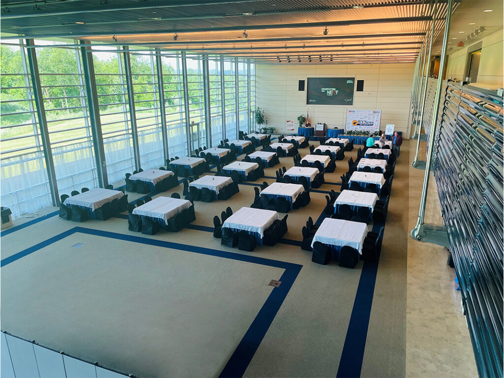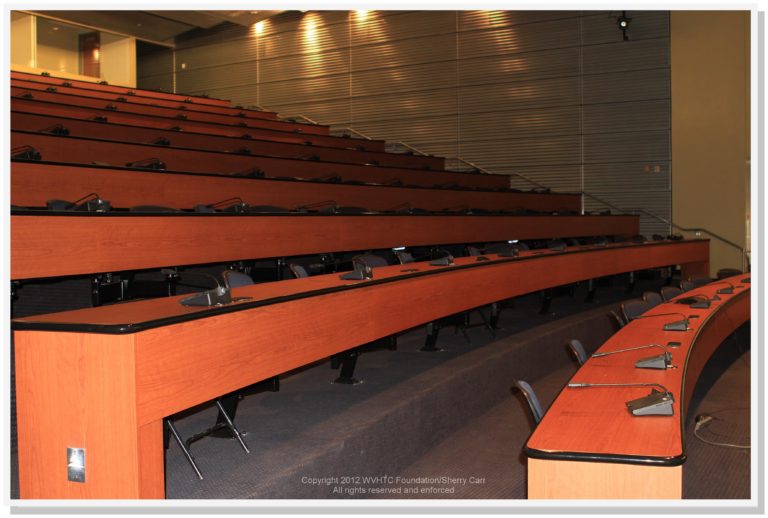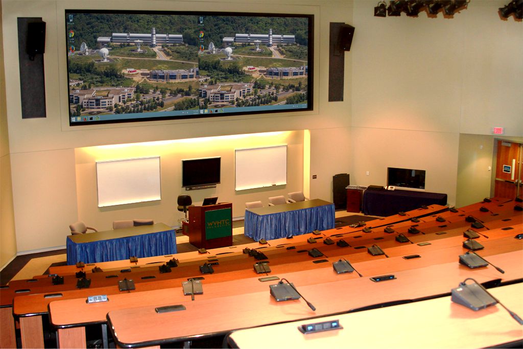 The Exhibition Hall provides a wired and wireless sound system that provides comfortable listening from anywhere within the space. The podium is fully equipped to accommodate the use of computer-based presentations, DVD/Blu-Ray programs, and connectivity to personal laptops. A wall-mounted pan/tilt/zoom camera is available to project the presenter’s image and audience participants on the big screen, for activities like Town Hall meetings.